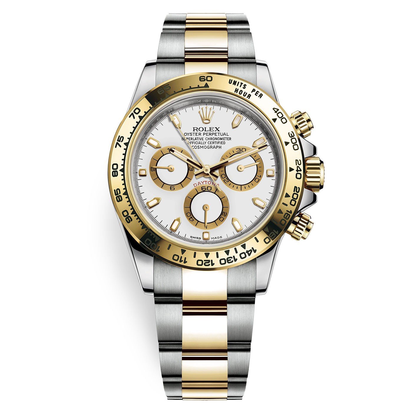 This Oyster Perpetual Cosmograph Daytona in 18 ct yellow gold, with a white dial and an Oyster bracelet, features an 18 ct yellow gold bezel with engraved tachymetric scale.