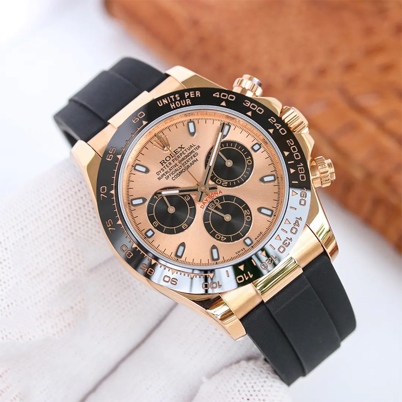 The Daytona’s chronograph feature functions are activated by pushers that screw down like the winding crown when they are not in use, guaranteeing waterproofness to 100 metres. One press to start, stop or reset the chronograph produces a crisp, clear click that was perfected using the most advanced technology. watchmakers also perfected the mechanism to suit the ideal finger pressure on the pushers, and engineered it to provide an instantaneous and accurate start to the timing without sacrificing reliability.