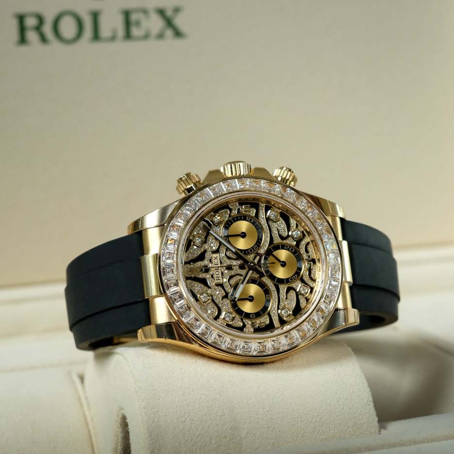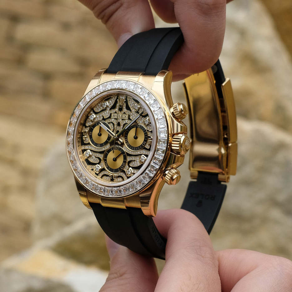 A Rolex Daytona with diamonds is not something new but one with a dial like the 116588TBR sure is! The black-lacquered dial has an applied 18k yellow-gold and diamond-set, wavy structure on the surface, which can remind you of a tiger's fur.