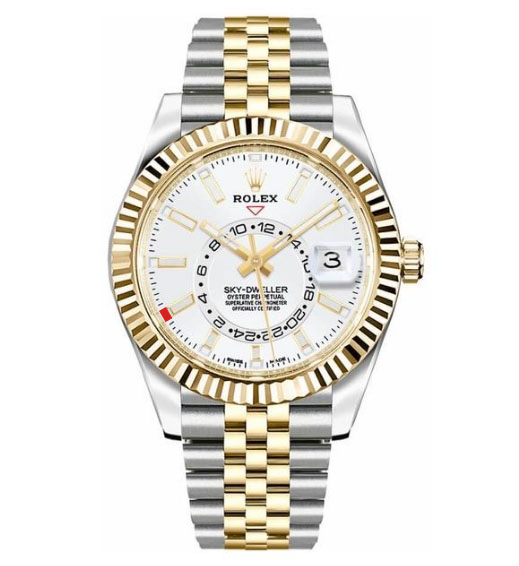Sky-Dweller Jubilee Bracelet Men's Luxury Watch 326933-0010. This 42mm watch features a stainless steel case with an 18k yellow gold fluted bezel and a two tone Jubilee bracelet. The white dial has index hour markers, a GMT second time zone feature and an annual calendar. It is powered by the Caliber 9001 self-winding automatic COSC Superlative Chronometer certified movement with a 72-hour power reserve.